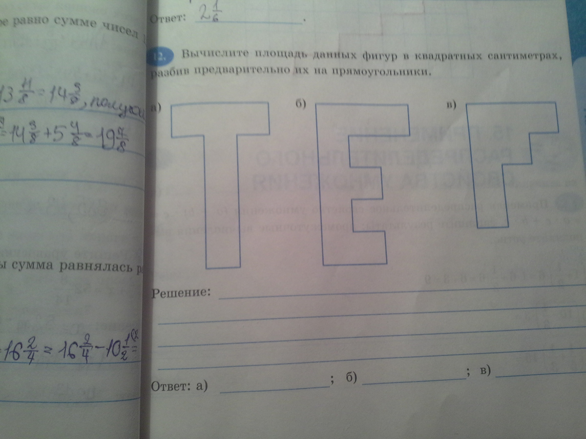 Вычислитеплощадь данных фигур предварительно разбив их на прямоугольники (в квадратных сантиметрах) см. картинку