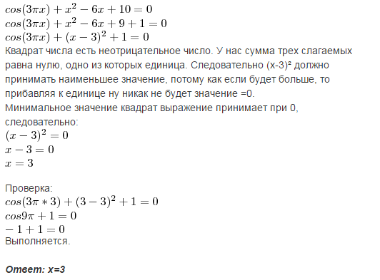 Квадрат числа есть неотрицательное число. У нас сумма трех слагаемых равна нулю, одно из которых единица. Следовательно (x-3)² должно принимать наименьшее значение, потому как если будет больше, то прибавляя к единице ну никак не будет значение =0.