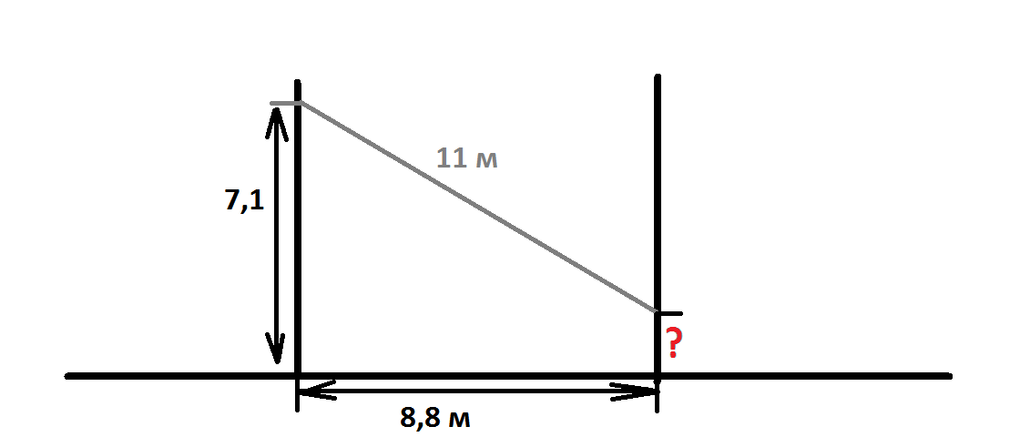 1)На противоположных стенах зала, расстояние между которыми 8,8 м, закреплены 2 крюка, между ними натянута веревка длиной 11м. один из крюков закреплен выше другого, на высоте 7,1 м от пола. (рис 1). найдите, на какой высоте от пола (в м) закреплен 2 крюк.