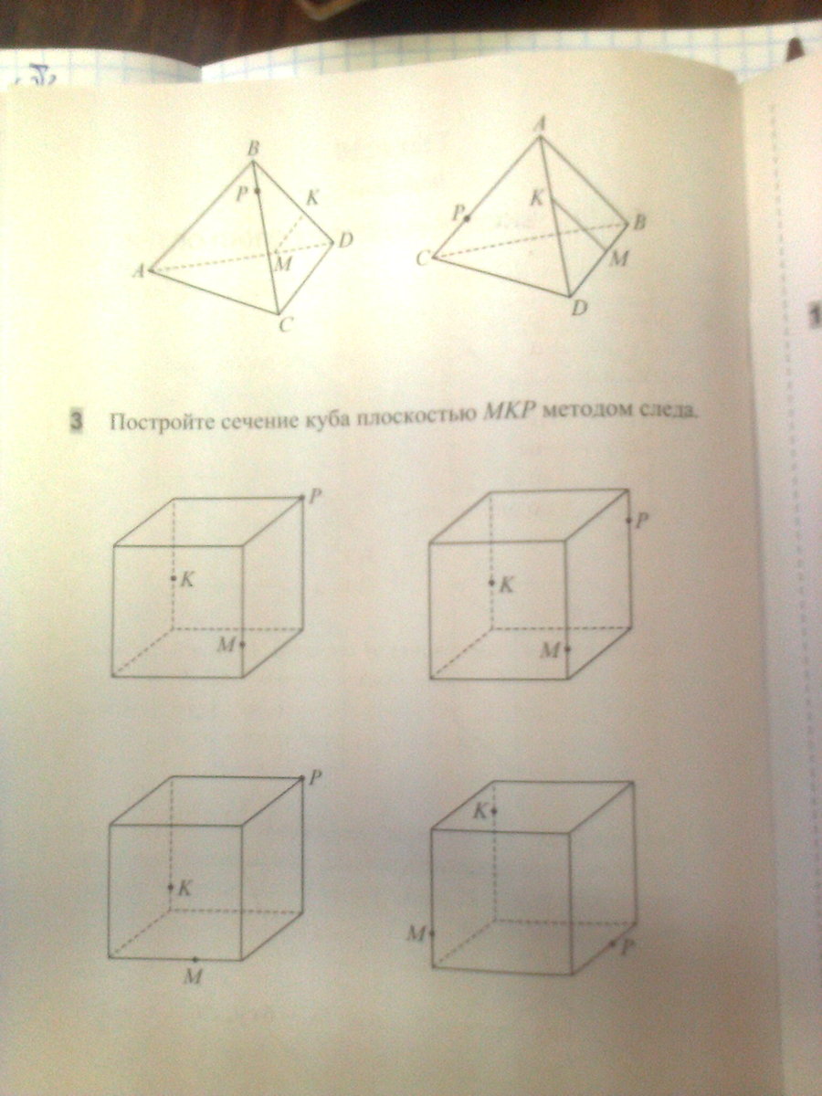 Первый куб : проводишь прямую KP, проводишь прямую из нижнего ребра дальней грани. Они пересекутся в точке, которая принадлежит сечению. Проводишь прямую PM, проводишь прямую из нижнего ребра правой грани. Они пересекутся в точку, принадлежащей сечению. Соединяешь эти две точки. Получаешь ещё 2 точки своего сечения, которые будут в нижней грани.