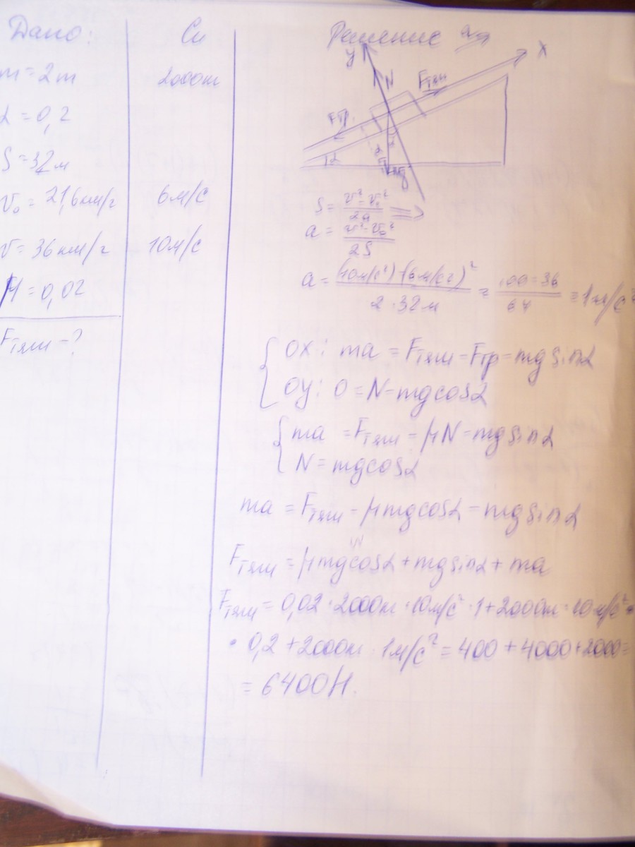 Автомобиль массой 2т поднимается в гору, уклон которой равен 0,2. На участве пути, равном 32 м, скоростьавтомобиля возросла от 21,6 до 36 км/ч. Считая движение автомобиля равноускоренным, найдите силу тяги двигателя. Коэффицент сопротивления движению равен 0,02.