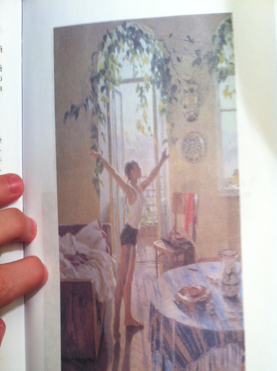 На картине Т.Н. Яблонской «Утро» изображена девочка, делающая утреннюю зарядку. Яблонская всегда оптимистично воспринимала жизнь, и картина ее дышит открытостью и простотой. В центре полотна стройная, высокая фигура девочки. Она стоит около открытой балконной двери, выполняя гимнастические упражнения. Подняв вверх руки, немного прогнувшись, девочка потягивается, словно танцуя. Ее поза говорит о радостном настроении, бодрости, наполняющем ее. Она тянется навстречу солнцу и новому дню. Глядя на героиню картины, невольно чувствуешь к ней симпатию. Кажется, что вместе с девочкой радуется наступающему утру все вокруг. Комната озарена яркими солнечными лучами. Высокое арочное окно и такая же балконная дверь создают ощущение свободы и простора. Обстановка комнаты проста: в центре круглый стол, покрытый бело-голубой скатертью, слева незаправленная кровать, на заднем плане стул, на котором аккуратно сложена школьная форма. На столе девочку ждет простой завтрак: кувшин с молоком, хлеб, масло. На светлой стене декоративная тарелка с двумя птицами и кашпо с вьющимся цветком, который красивой аркой обрамляет балконную дверь. На паркетный пол падают длинные утренние тени. Вдали виден просыпающийся город, одетый утренней дымкой. Картина «Утро» Т.Н. Яблонской светлая и радостная. Она является гимном новому дню, дарит заряд бодрости. Глядя на это полотно, хочется так же, как девочка, распахнуть окно, впустить свежий утренний воздух, сделать зарядку, и весь день ощущать прилив сил