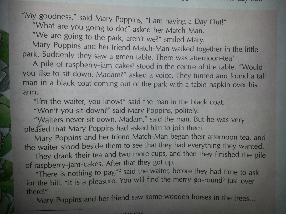 «Официанты никогда не садятся, мадам», — сказал мужчина. По ему было очень приятно, что Мэри Поппинс пригласила его присоединиться к ним.