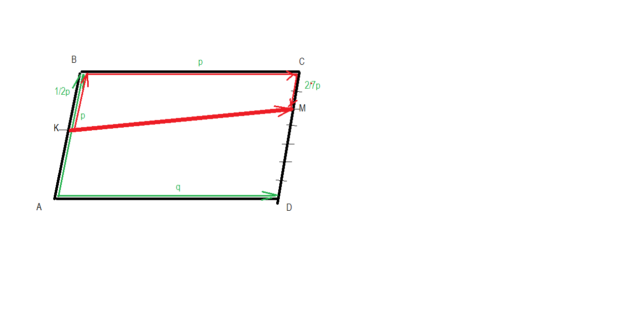 KM=KB+BC+CM=AB/2+AD-MC=p/2+q-2/7*p=(7-4)/14*p+q=3/14*p+q =q+3p/14