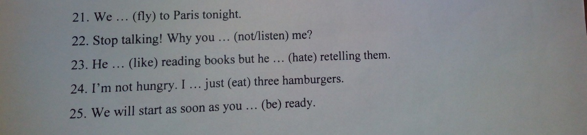 1)We are flyin' to Paris tonight.2)Stop talkin.Why aren't ya listenin to me?3)He likes readin book,but he hates retellin 'em.4)I'm not hungry.I've just eaten 3 hamburgers.5)We'll start as soon as u're ready.