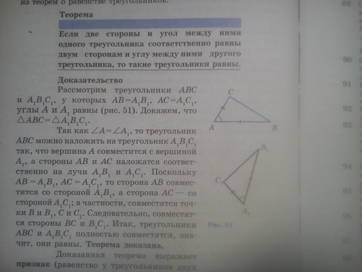 первый признак равенства треугольников с рисунком из учебника геометрии