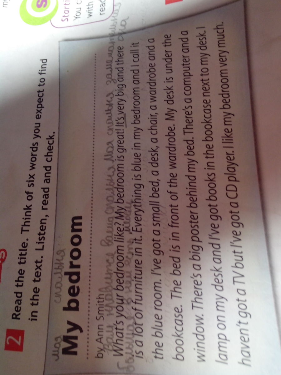 На что похожа ваша спальня? Моя спальня замечательная. Она очень большая и в ней есть много мебели. В моей спальне все синее и я назвала ее синей комнатой. У меня есть маленькая кроватка, стол, стул, шифоньер и книжный шкаф. Кровать напротив шифонера. Моя парта под окном. за моей кроватью висит большой постер. На моем столе стоит компьютер и лампа в моем книжном шкафу есть книги он около моего стола. У меня нет телевизора, но есть SD проигрыватель. Мне очень нравится моя спальня.