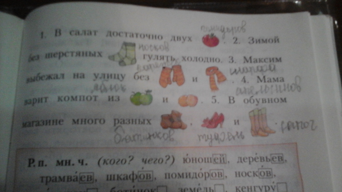 В салат достаточно двух помидоров.Зимой без шерстяных носков гулять холодно.Максим выбежал на улицу без варежек и шарфа. Мама варит компот из яблок и персиков. В обувном магазине много разных ботинок, туфель и сапог.