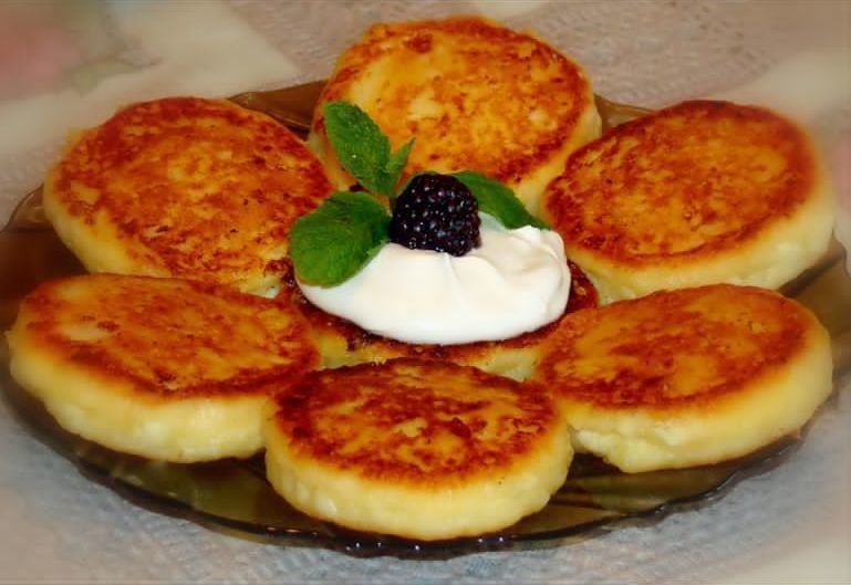 Put 350 g of cottage cheese in a bowl and mash it. Add 2 eggs, 2 tablespoons of sugar and mix. Now add 5 tablespoons of flour and mix again. Put the pan on medium heat and pour some sunflower oil into it. Pour little flour on the plate. Shape a few small balls and place them on the plate. Now make small buns and put them in the frying pan. Fry cheesecakes for 1-2 minutes until the golden crust appears. Then flip them to the other side and fry. Bon appetit!