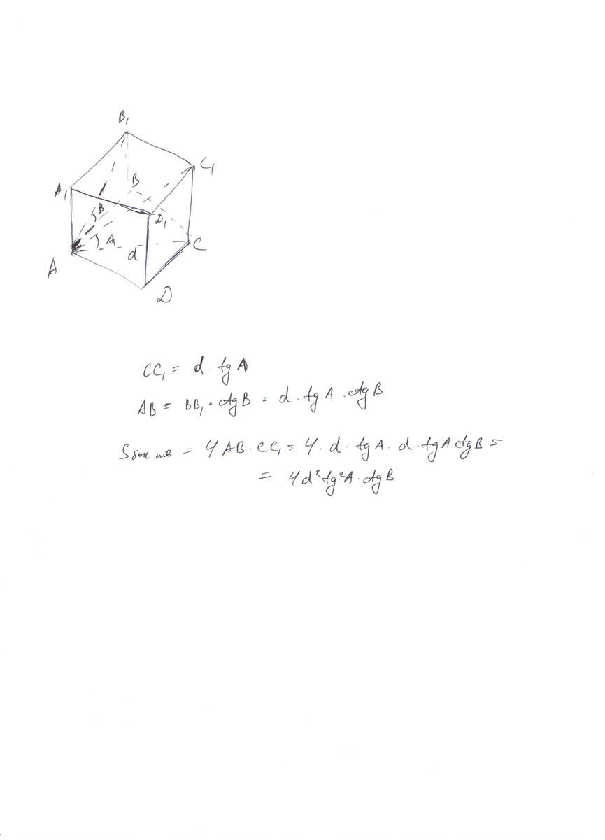 Найдите площадь боковой поверхности прямой призмы, большая диагональ которой образует с плоскостью основания угол А, если в основе призмы лежит ромб с большей диагональю d, а диагональ боковой грани призмы образует с плоскостью ее основания угол В