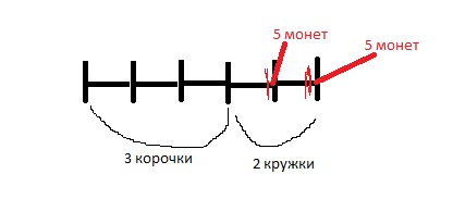 за 3 корочки хлеба и 2 кружки молока надо заплатить 20 монет. Сколько стоит одна корочка хлеба,если она дешевле одной кружки молока на 5 монет?