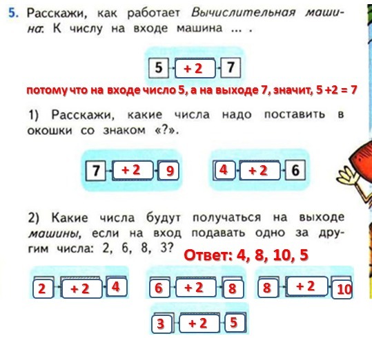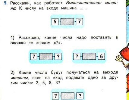 Как работает вычислительная машина: К числу на входе машина... 5- -7.а)какие числа надо поставить в окошки со знаком "?" 7- -? ?- -6 б)какие числа будут получаться на выходе машины, если на вход подавать одно за другим числа: 2,6,8,3?