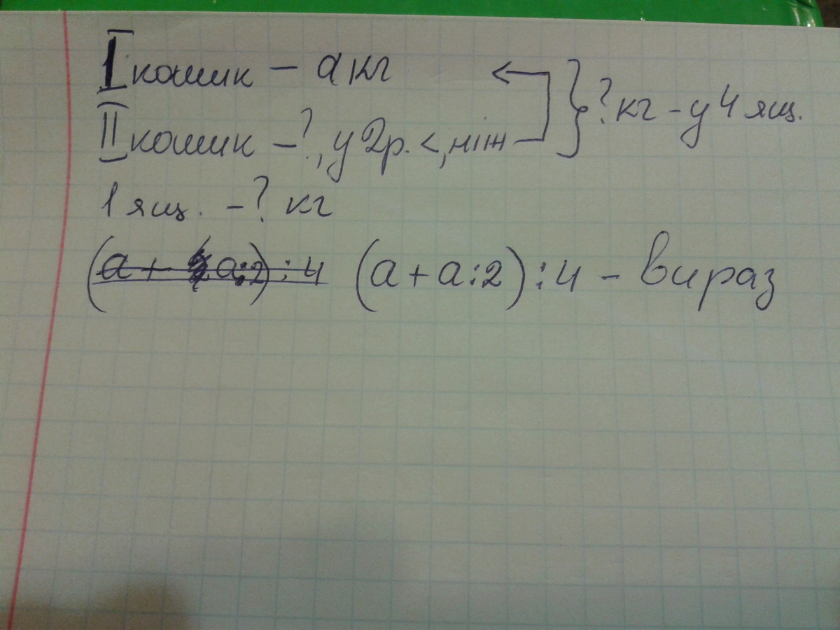Як записати задачу 352, стор. 50 із підручника Богдановича? В одному кошику а кг вмнограду, а в другому - у 2 рази менше. Увесь віноград роклали в чотири ящики порівну. Скільки кілограмів винограду в одному ящику? Потрібно знати, як записати услів'я