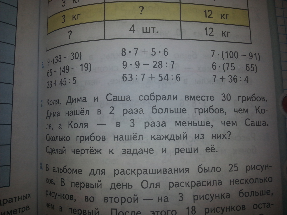 коля дима и саша собрали вместе 30грибов диманашелв 2 раза больше грибовчем коля а коля в 3 раза меньше чем сашасколько грибов нашел каждый из нихзделай чертеж и реши ее