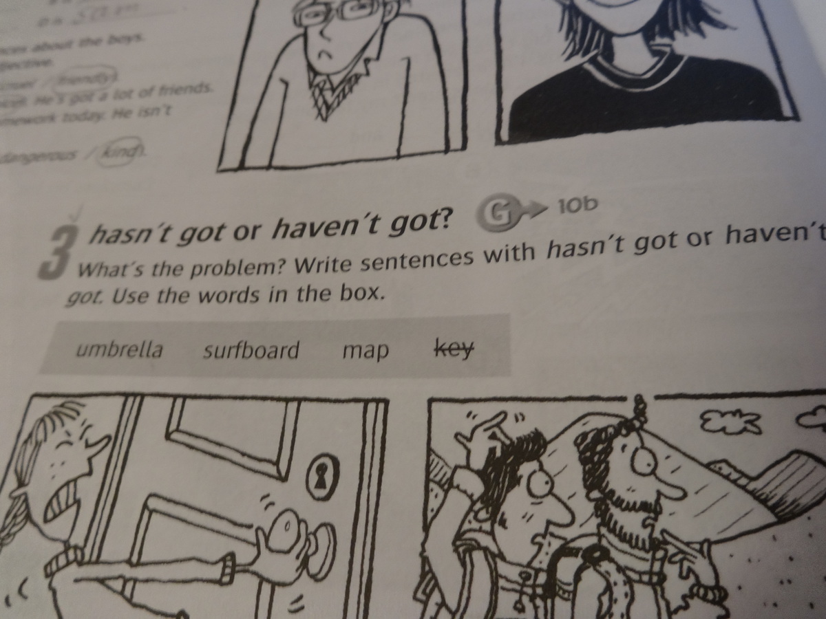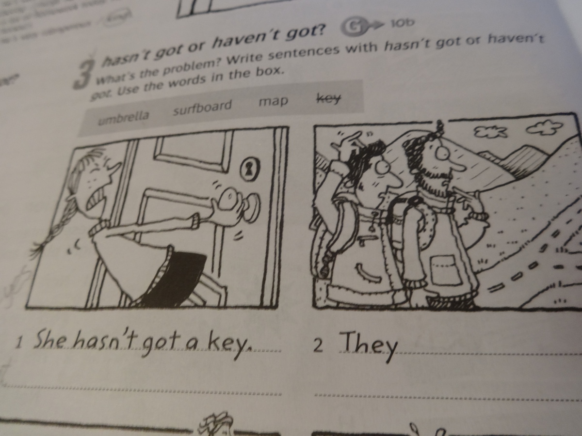 2.They haven't got a map.3. He hasn't got a surfboard. 4. They haven't got an umbrella.