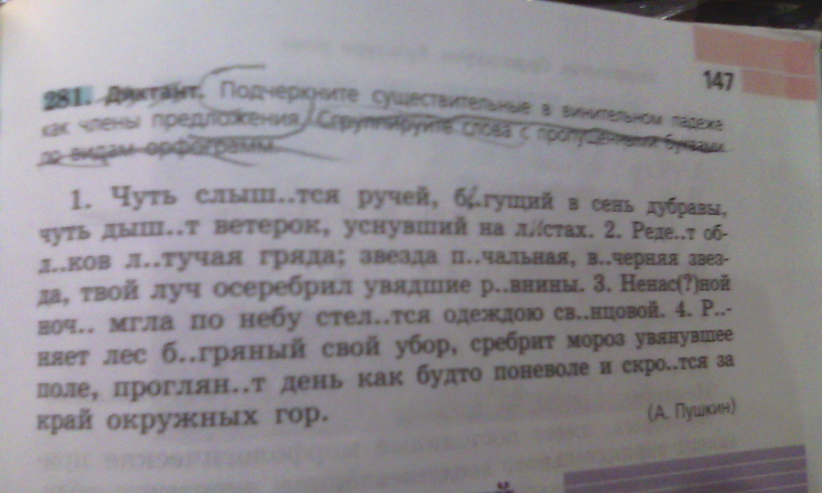 Винительный падеж: 1 предлож. - в сень, 2 предлож. - равнины, в 3 предлож. нет винит. падежа, 4 предлож. - убор, поле, за край.