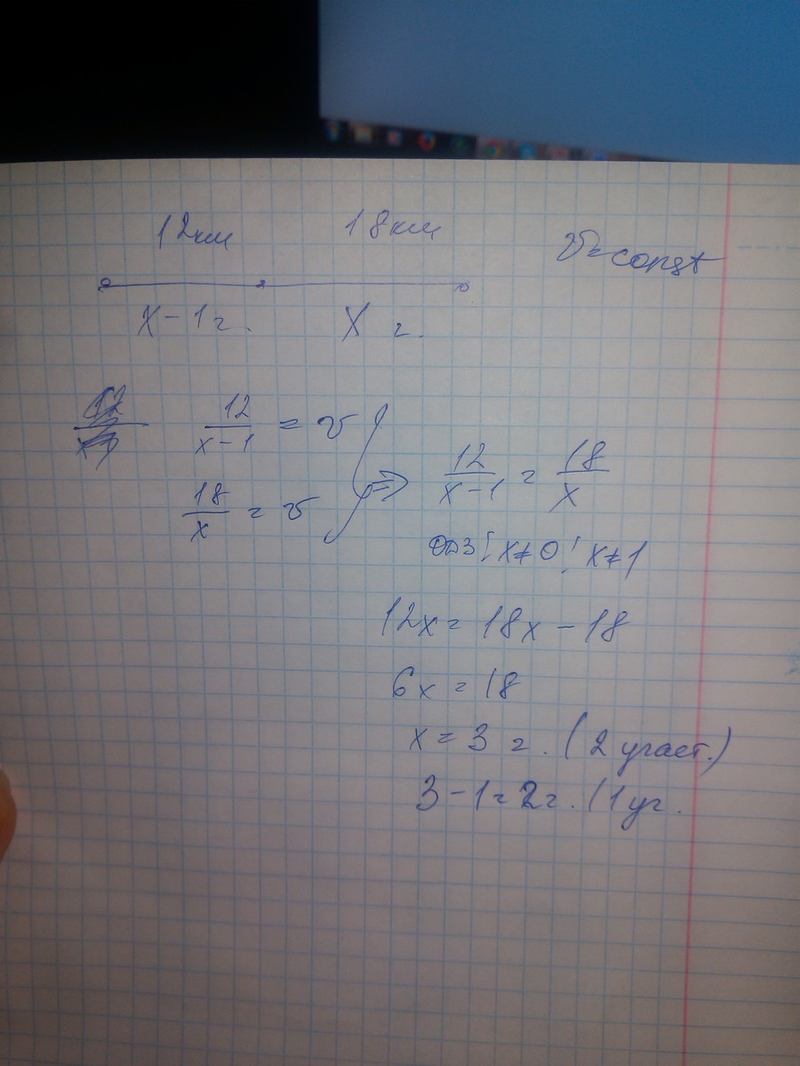 турист прошел сначала 12 км а потом ещё 18 км двигаясь одной и той же скоростью. какое время он затратил на каждый участок пути если на движение по