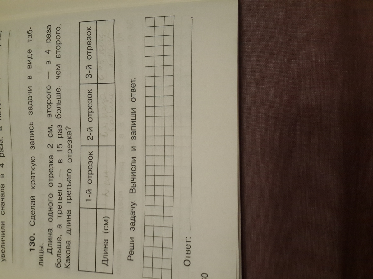 Помогите с задачей!Длина одного отрезка 2см,второго в 4 раза больше,а третьего в 15 раз больше,чем второго.Какова длина третьего отрещка?
