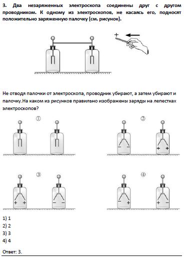 Правильная картинка - 3-я. Электризация влиянием. Свободные заряды проводников стержня и электроскопов под действием электрического поля перераспределяются. Электроны, притягиваемые положительным зарядом, перемещаются к правому электроскопу, заряжая лепестки отрицательно. Недостаток электронов на левом электроскопе создают положительный заряд на лепестках левого электроскопа.