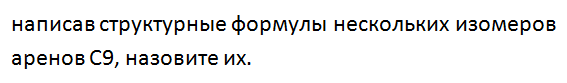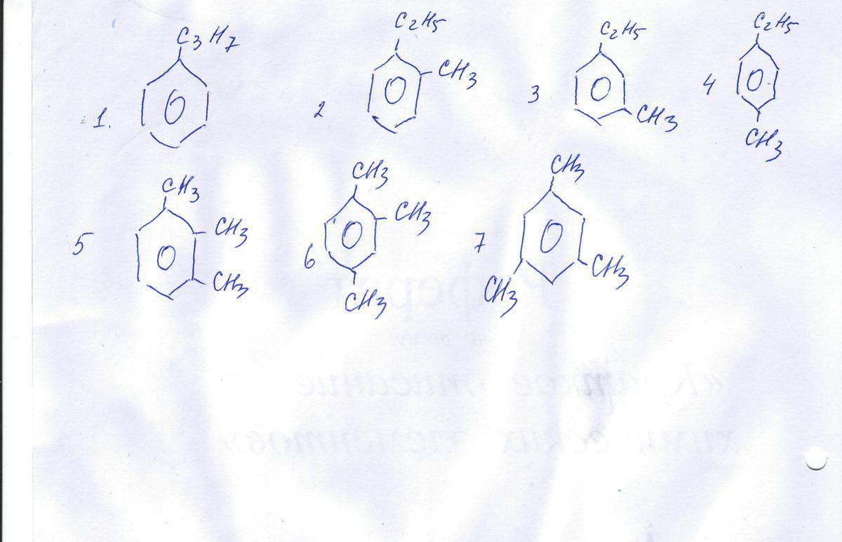 Смотри скан - там структурные формулы изомеров. А здесь - их названия1пропил бензол2 орто-метилэтилбензол3 мета-метилэтилбензол4 пара-метилэтилбензол5 1,2,3-триметилбензол6 1,2,4-триметилбензол7 1,3,5-тримелбензол1 монозамещенный изомер2-4 - дизамещенные5-7 - тризамещенные