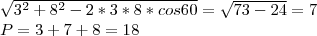 Внешний угол при вершине М треугольника МКР равен 120°, МК=3 см, МР=8 см. Вычислите периметр данного труегольник.