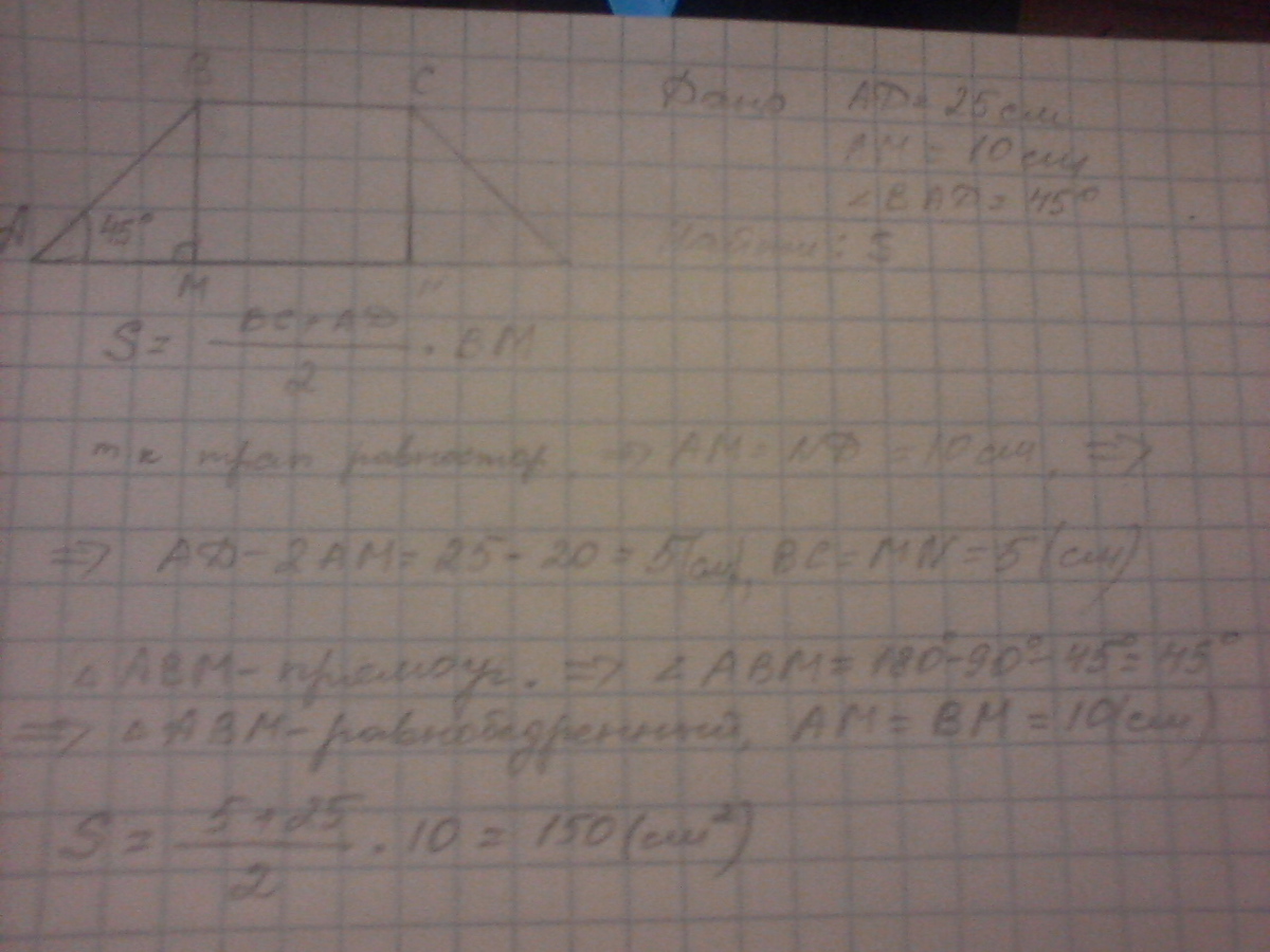 в равнобедренной трапеции ABCD большее основание AD равно 25 см, высота BM отсекает от AD отрезок AM, равный 10 см. Угол BAD равен 45 градусов. Найдите площадь трапеции