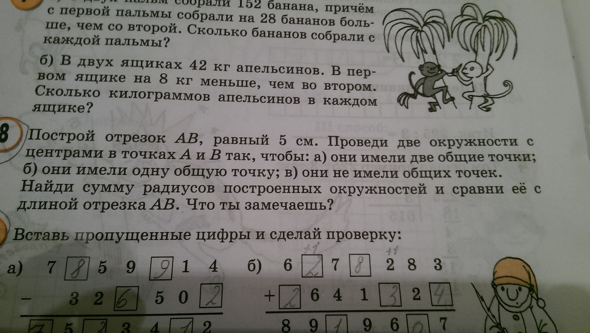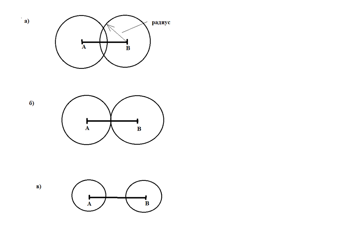построй отрезок а.б,равный 5 см провели две окружности с центрами в точках а и б так чтобы ;а) имели две общие точки б.имели одну общую точку в.они не имели общих точек.найди сумму радиусов построенных окружностей и сравни её с длиной отрезка а.б .Что ты замечаешь