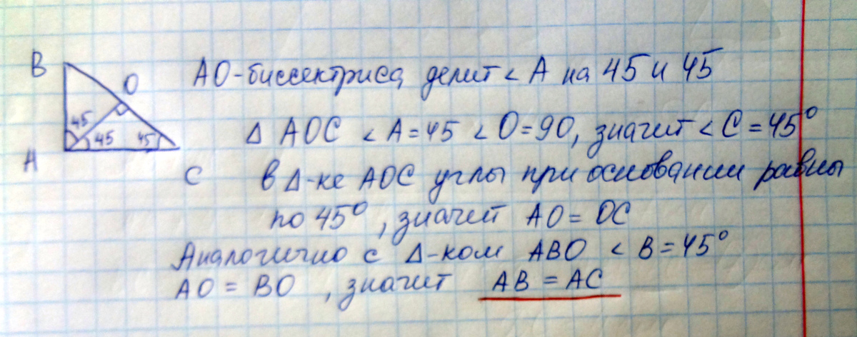 докажите, что если биссектриса прямого угла прямоугольного треугольника перпендикулярна гипотенузе, то такой треугоник равнобедренный