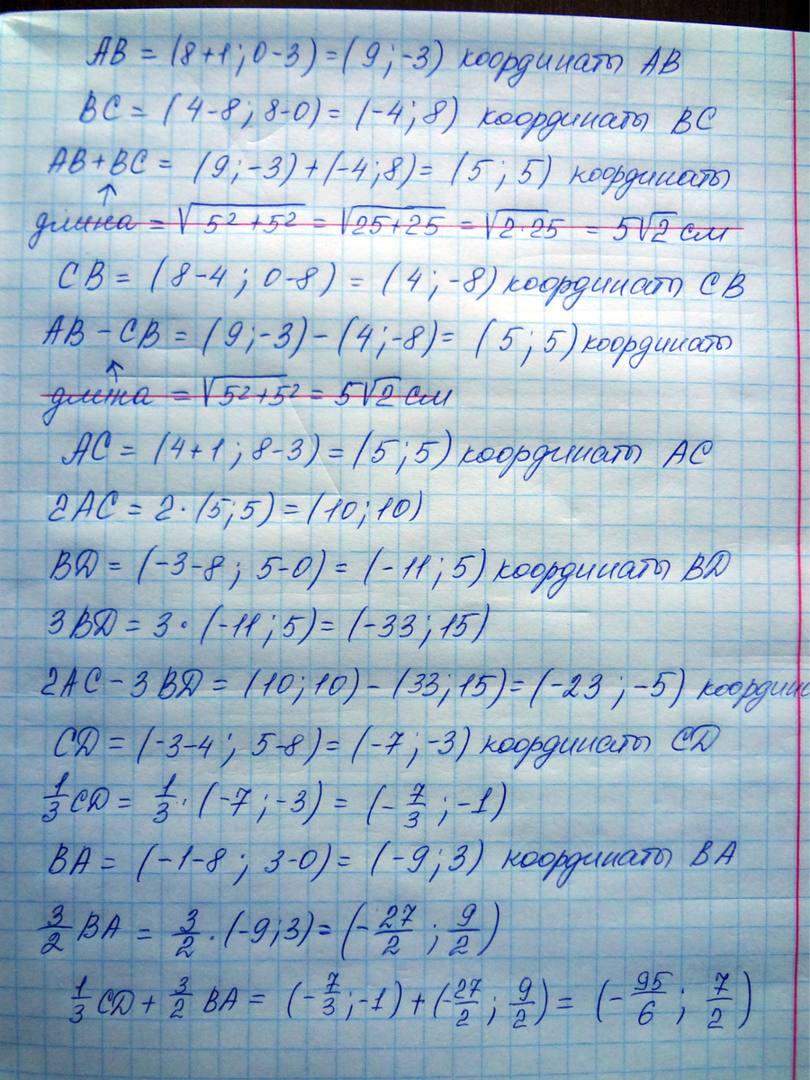 даны точки A(-1;3),B(8;0),C(4;8),D(-3;5). определите координаты векторов:1)AB+BC; 2)AB-CB; 3)2AC-3BD; 4)1/3CD+3/2BA