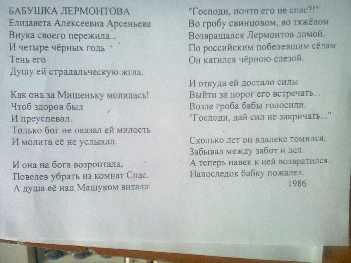 В 1841 году погиб один из самых талпнтливейших поэтов России. Этим человеком был Михаил Юрьевич Лермонтов. Его творчество охватило многие стороны человеческой жизни. Стихотворение А. Дементьева " Бабушка Лермонтова" открывает нам частичку тех чувств, которые переживали бабушка и Россия, оплакивая своего внука и поэта. Но одно, что сделала бабушка неправильно- это то, что она обвинила Бога, возроптав на Него (т.е. на Бога). Когда человек в тяжелой ситуации ропщет на Бога, то у него исчезает вера, терпение, надежда, и он сам начинает по-тихоньку, незаметно для самого себя умирать.