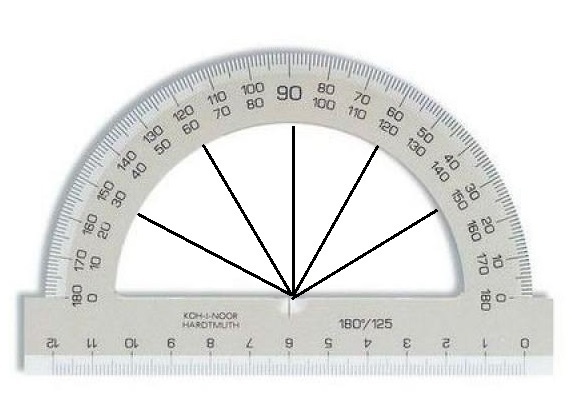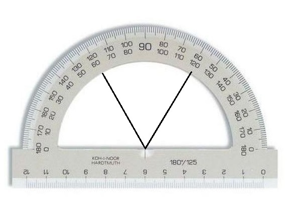 180°:6=30° - берем транспортир отмеряет на полуокружности 30,60,90,120,150 градусов.