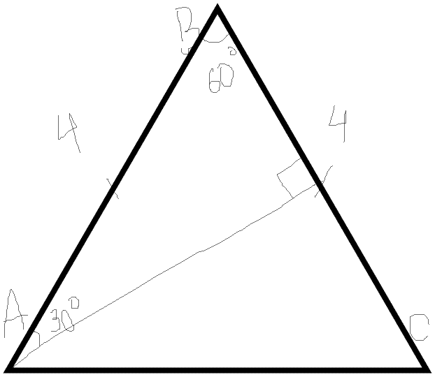 Угол при вершине равнобедренного треугольника равен 60 градусов, боковая сторона равна 4. Найдите длину высоты, проведённой к этой стороне.