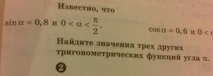 Помогите решить sin a= 0.8 и 0 Нужно найти значения остальных трёх тригонометрических функций угла а