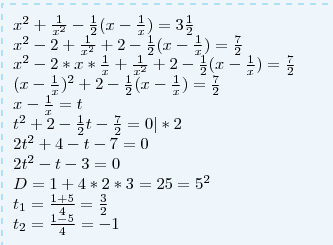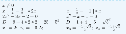 все умножаешь на 2x^2 дальше вводишь новую переменную решаешь квадратное ур-е через виета