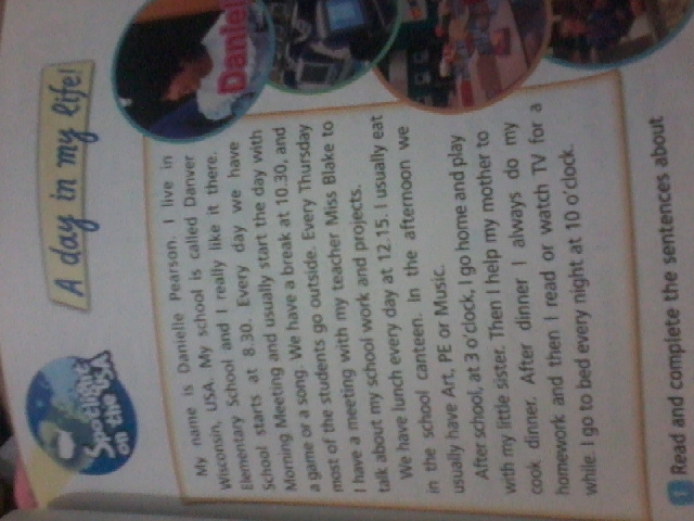 Меня зовут Даниэль Персон. Я живу в Винсконсине, США. Моя школа называется Danver Elementary School и мне реально это нравится. Уроки начинаются в 8:30. У нас есть утренние упражнения и иногда мы начинаем день с игр или с песни мы имеем перерыв в 10:30 и некоторые ученики выходят погулять. Каждый четверг я встречаю свою учительницу Мисс Блэк и говорим о моем проекте.