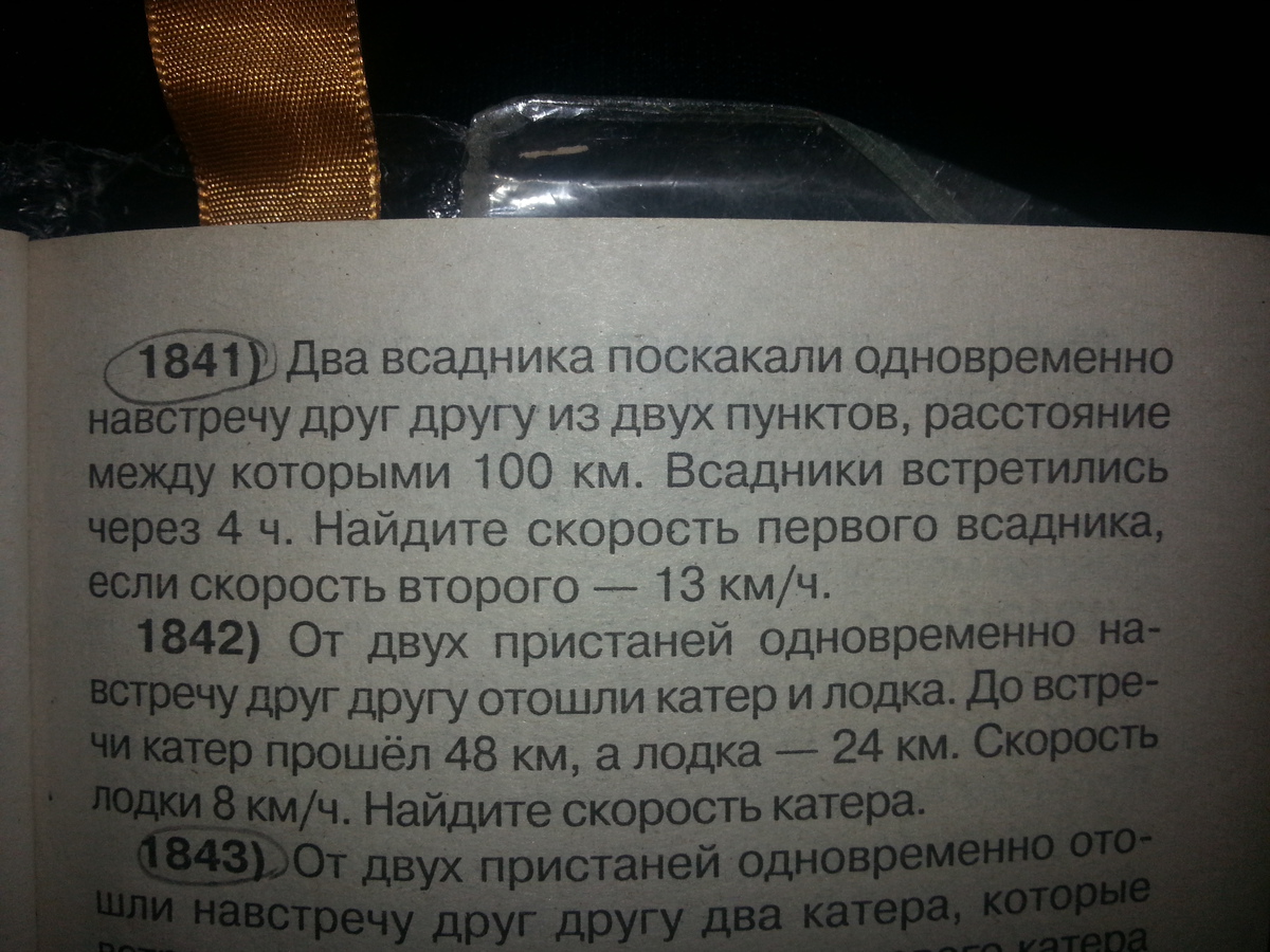 два всадника поскакали одновременно навстречу друг другу из двух пунктов, расстояние между которыми 100км. всадники встретились через 4ч. найдите скорость первого всадника, если скорость второго-13 км/ч.
