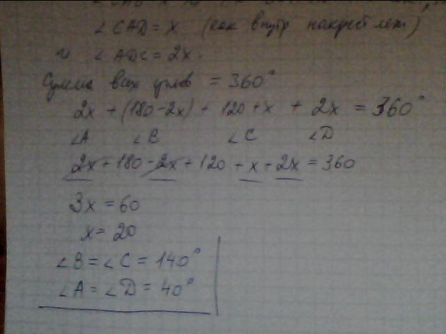 В р/б трапеции углы при каждом основании равны, сумма углов четырехугольника равна 360 град. Начерти рисунок. Смотри вложения: начало 22 окончание 23