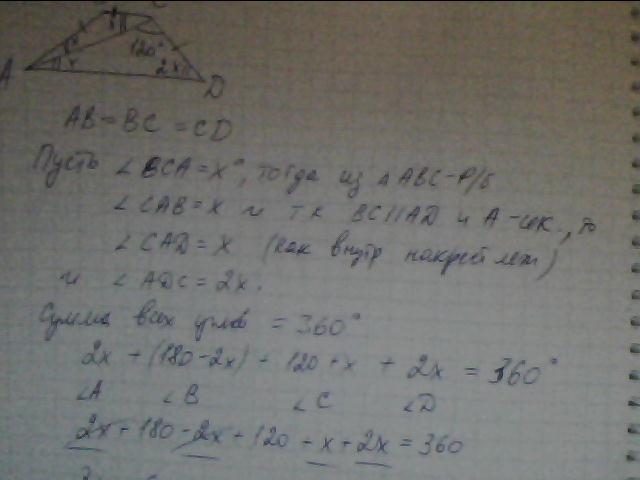 в равнобедренной трапеции диагональ составляет с боковой стороной угол в 120 градусов, боковая сторона равна меньшему основанию.найти углы трапеции.