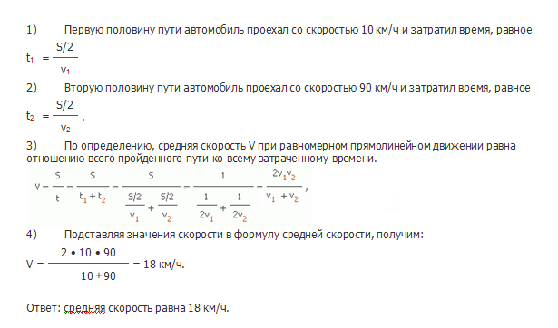 Первую половину пути автомобиль проехал со скоростью 10 км/ч, а вторую половину пути со скоростью 90 км/ч. Найдите среднюю скорость на всём пути.