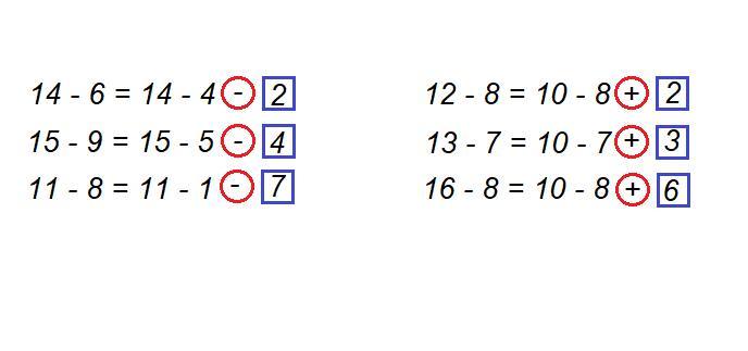 как решить примеры поставить знаки + или - вот примеры 14-6=14-4 ...,... 15-9=15-5...,... 11-8=11-1...,... 12-8=10-8...,... 13-7=10-7...,... 16-8=10-8...,...