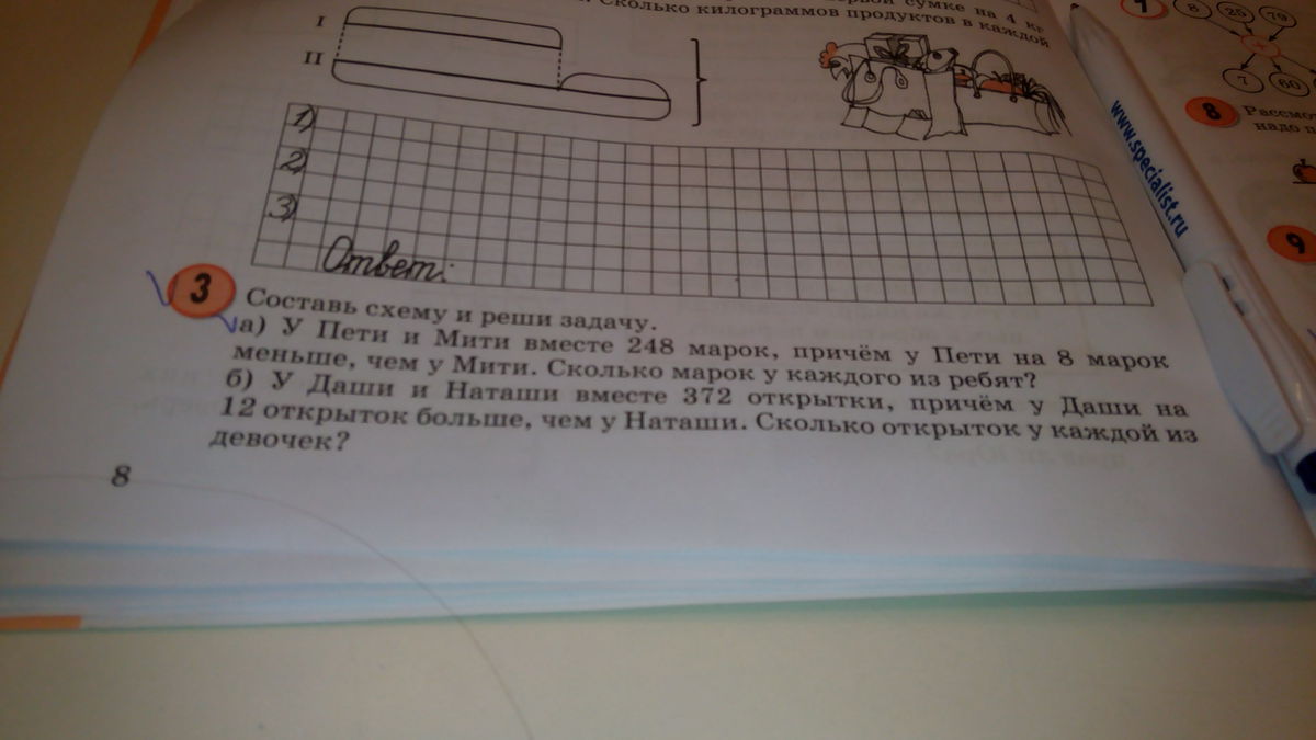 пусть у Пети Х марок, тогда у Мити Х + 8 марок. Х + Х + 8=248 2Х + 8 = 248 2Х =240 Х = 120 марок у Пети. 120 + 8 = 128 марок у Мити. проверяем: 120 + 128 = 248 все верно. Ответ: 120 марок у Пети и 128 марок у Мити.