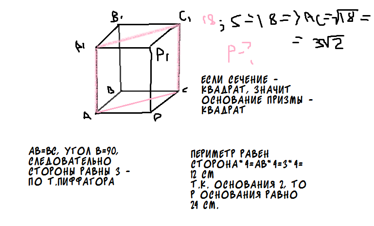 диагональное сечениеправильной четырехугольной призмы квадрат пощадью 18 см.Вычислите периметр основания призмы