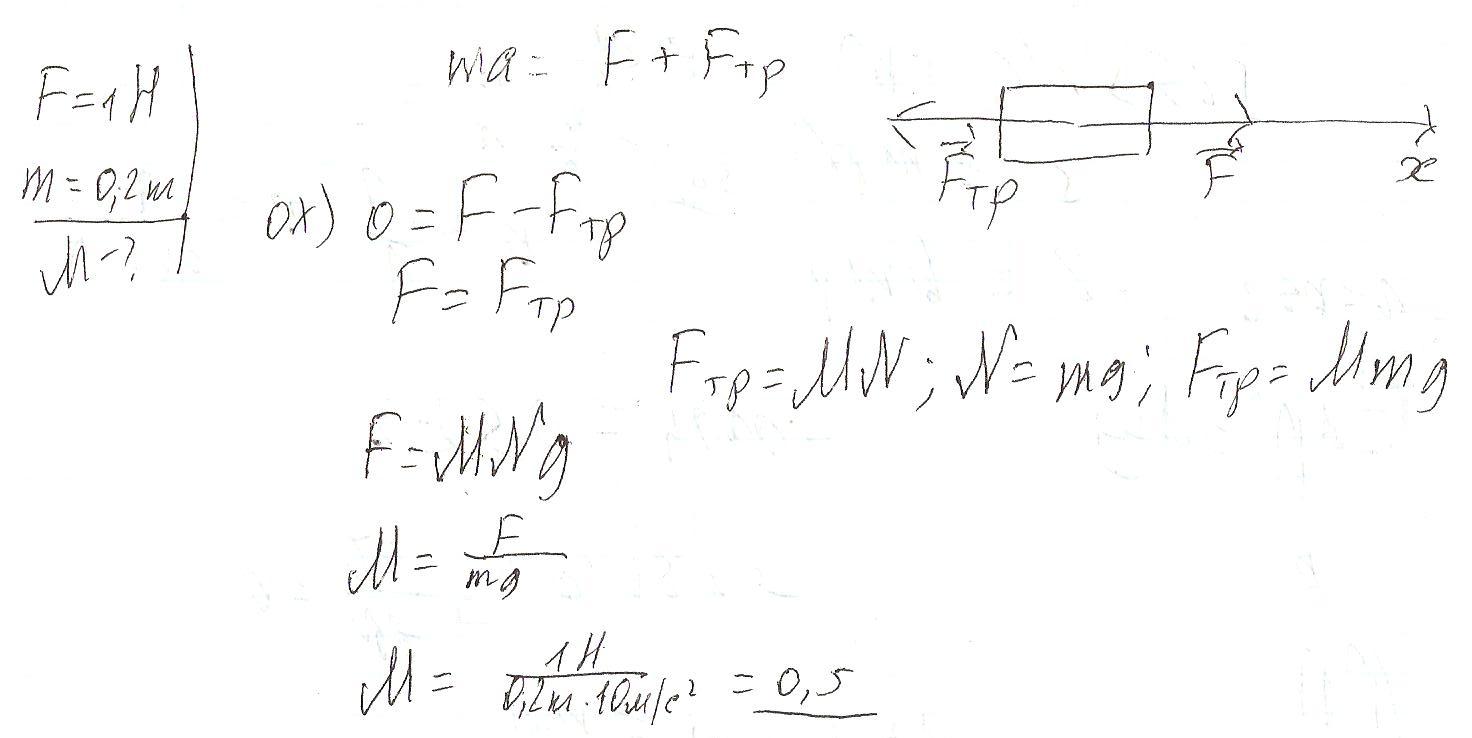 Тело массой 200 г равномерно тянут по горизонтальной поверхности с помощью динамометра. Чему равен коэффициент трения скольжения, если динамометр показывает 1Н? обязательно с рисунком!