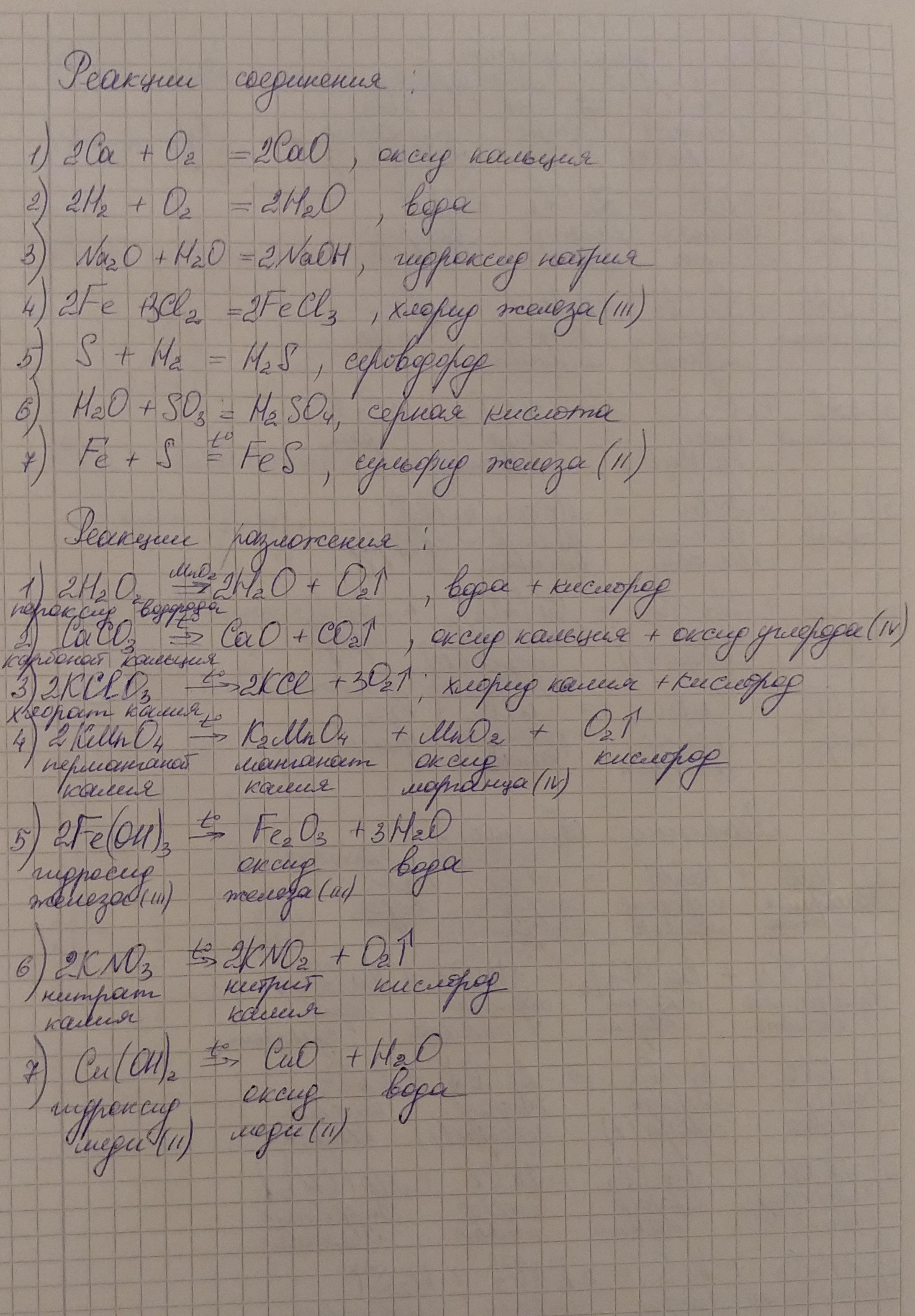 ПРИВЕДИТЕ ПРИМЕРЫ!реакции соединения, реакции разложения, реакции замещения и реакции обмена.