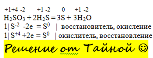 H2SO3+H2S=S+H2O для данной реакции подберите коэффициенты методом электронного баланса.Укажите окислитель и восстановитель