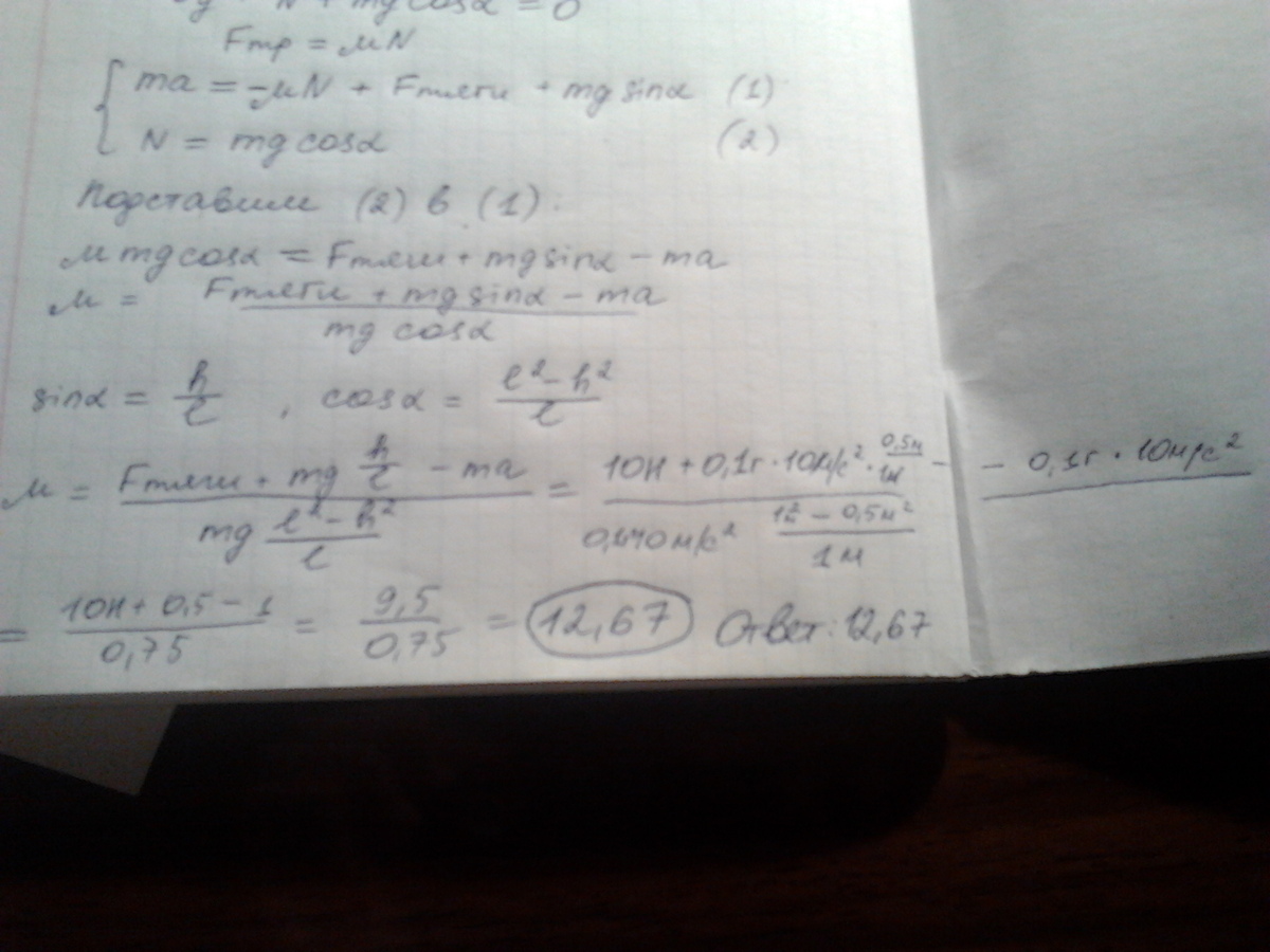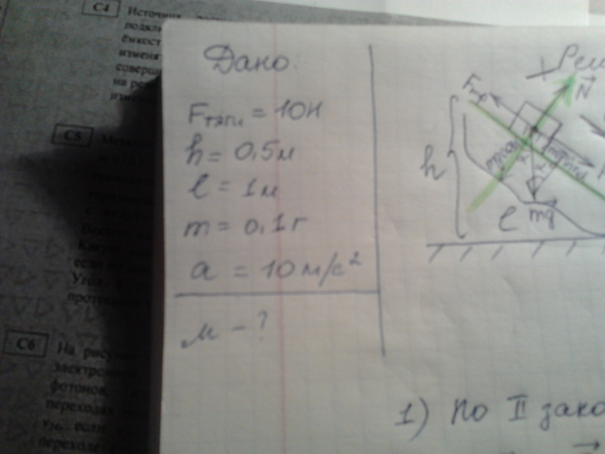 Тело, под действием силы 10 Н (Ньютон) движется вниз по наклонной плоскости, у которой известна высота 0,5 м. и длина 1 м., тело массой 100 грамм и ускорением 10 (м/c^2). Определить коэффициент силы трения этой плоскости.