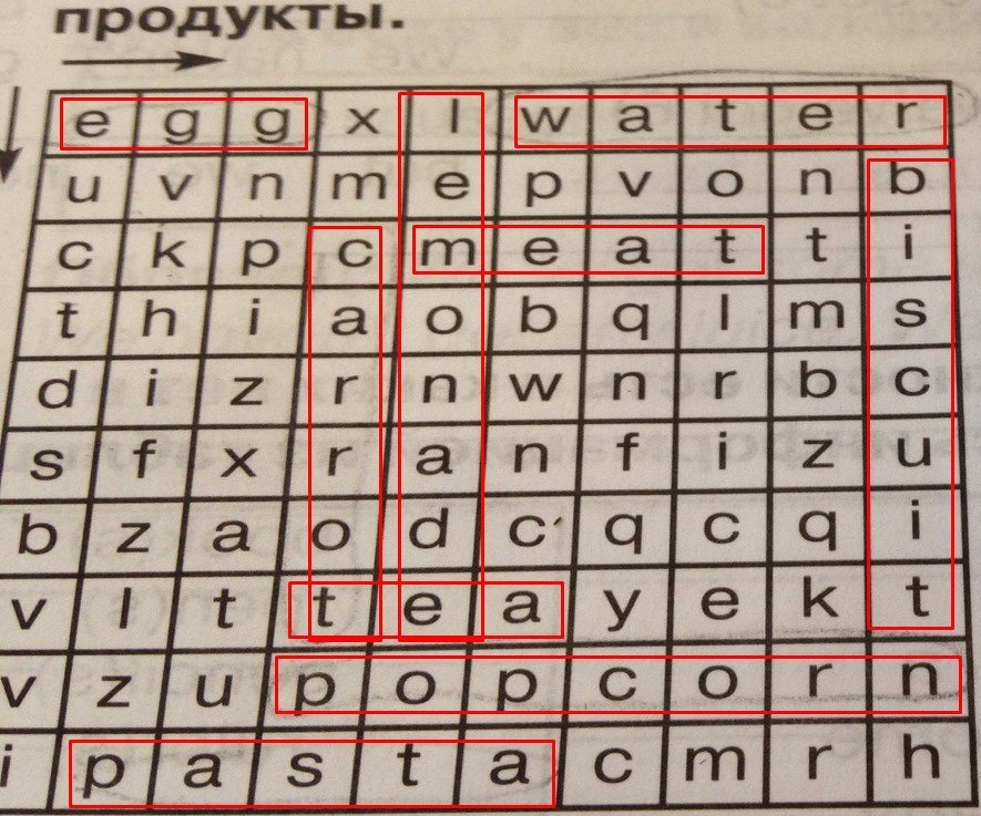 Найди и обведи в квадрате 10 слов, обозночающих продукты. Помогите некоторые нашла другие не могу... :(