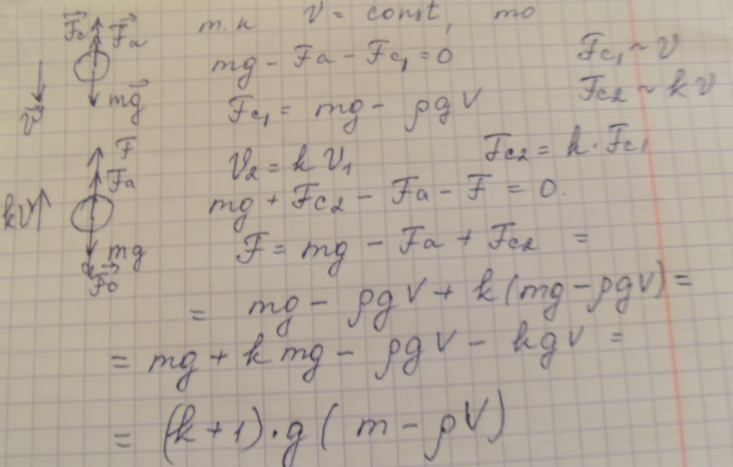 ПОМОГИТЕ ПОЖАЛУЙСТА РЕШИТЬ! Шар массой m, объемом V падает в жидкости плотностью ρ с постоянной скоростью U1. С какой силой f нужно тянуть вверх этот шар, чтобы он поднимался в той же жидкости со скоростью U 2= k*U1??