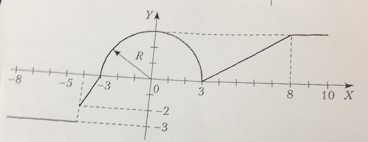 ![1. y=-3; x in (-infty;-4] \ 2. frac{y-y_1}{y_2-y_1}= frac{x-x_1}{x_2-x_1}; \ frac{y-(-2)}{0-(-2)}= frac{x-(-4)}{-3-(-4)}; frac{y+2}{2}=x+4 to y=2x+8; x in (-4;-3] \ 3. x^2+y^2=9 to y= sqrt{9-x^2}; x in (-3;3] \ 4. frac{y-0}{3-0}= frac{x-3}{8-3}; frac{y}{3}= frac{x-3}{5} to y=0.6(x-3); x in (3;8] \ 5. y=3; x in (8; +infty) 1. y=-3; x in (-infty;-4] \ 2. frac{y-y_1}{y_2-y_1}= frac{x-x_1}{x_2-x_1}; \ frac{y-(-2)}{0-(-2)}= frac{x-(-4)}{-3-(-4)}; frac{y+2}{2}=x+4 to y=2x+8; x in (-4;-3] \ 3. x^2+y^2=9 to y= sqrt{9-x^2}; x in (-3;3] \ 4. frac{y-0}{3-0}= frac{x-3}{8-3}; frac{y}{3}= frac{x-3}{5} to y=0.6(x-3); x in (3;8] \ 5. y=3; x in (8; +infty)](https://tex.z-dn.net/?f=1.+y%3D-3%3B++x+in+%28-infty%3B-4%5D+%5C+2.++frac%7By-y_1%7D%7By_2-y_1%7D%3D+frac%7Bx-x_1%7D%7Bx_2-x_1%7D%3B+%5C+frac%7By-%28-2%29%7D%7B0-%28-2%29%7D%3D+frac%7Bx-%28-4%29%7D%7B-3-%28-4%29%7D%3B+frac%7By%2B2%7D%7B2%7D%3Dx%2B4+to+y%3D2x%2B8%3B++x+in+%28-4%3B-3%5D+%5C+3.++x%5E2%2By%5E2%3D9+to+y%3D+sqrt%7B9-x%5E2%7D%3B++x+in+%28-3%3B3%5D+%5C+4.+++frac%7By-0%7D%7B3-0%7D%3D+frac%7Bx-3%7D%7B8-3%7D%3B++frac%7By%7D%7B3%7D%3D+frac%7Bx-3%7D%7B5%7D+to+y%3D0.6%28x-3%29%3B++x+in+%283%3B8%5D+%5C+5.++y%3D3%3B++x+in+%288%3B+%2Binfty%29+)