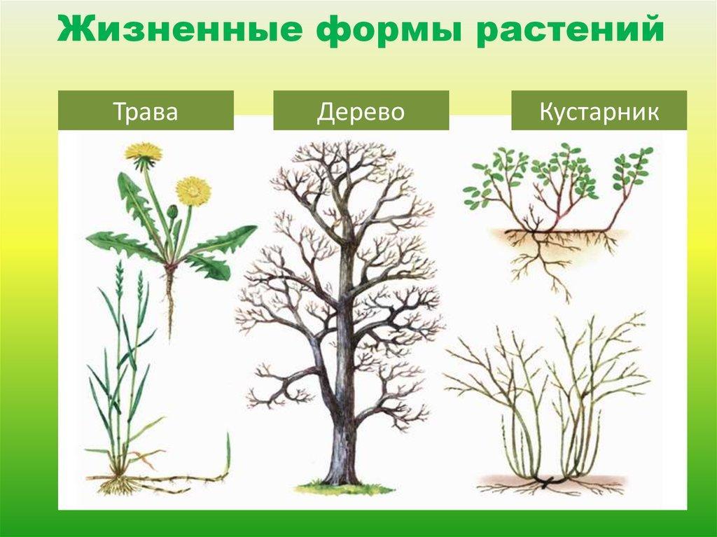 Трава, кустарник и дерево - это жизненные формы растений ( внешний вид растений).